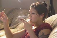 The "Real Life" series features attractive "real" girls smoking in natural settings, with front and back studio lighting. This video has natural audio, and is around one hour in length. In Real Life Mores 4 you will see Carrie, Frankie, Britney, and Moira. Britney shows us some open mouth inhales. The girls all smoke More 120's, and More Menthol 120's in this title.